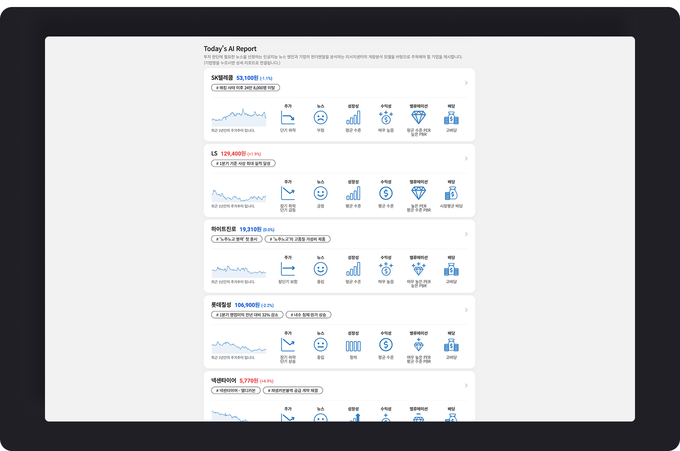 Supports the construction of various services such as investment information, analysis, and recommendations on app/web platforms. (e.g., K-Bank, Zuminternet)